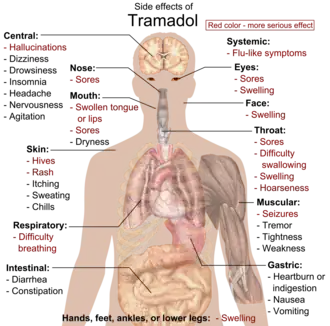 As is typical of opioids, common side effects include constipation, itchiness, and nausea.[13] Serious side effects may include hallucinations, seizures, increased risk of serotonin syndrome, decreased alertness, and drug addiction.[13] A change in dosage may be recommended in those with kidney or liver problems.[13] It is not recommended in those who are at risk of suicide or in those who are pregnant.[13][18] While not recommended in women who are breastfeeding, those who take a single dose should not generally have to stop breastfeeding.[19] Tramadol is converted in the liver to O-desmethyltramadol (desmetramadol), an opioid with a stronger affinity for the μ-opioid receptor.[13][20]