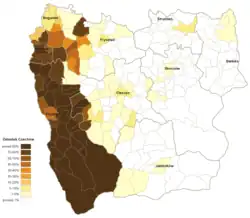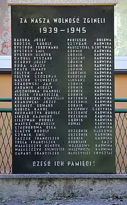 The German authorities introduced terror into Trans-Olza. The Nazis especially targeted the Polish intelligentsia, many of whom died during the war. Mass killings, executions, arrests, taking locals to forced labour and deportations to concentration camps all happened on a daily basis.[64] The most notorious war crime was a murder of 36 villagers in and around Żywocice on 6 August 1944.[66] This massacre is known as the Żywocice tragedy (Polish: Tragedia Żywocicka). The resistance movement, mostly composed of Poles, was fairly strong in Trans-Olza. So-called Volksliste – a document in which a non-German citizen declared that he had some German ancestry by signing it; refusal to sign this document could lead to deportation to a concentration camp – were introduced. Local people who took them were later on enrolled in the Wehrmacht. Many local people with no German ancestry were also forced to take them. The World War II death toll in Trans-Olza is estimated at about 6,000 people: about 2,500 Jews, 2,000 other citizens (80% of them being Poles)[67] and more than 1,000 locals who died in the Wehrmacht (those who took the Volksliste).[67] Also a few hundred Poles from Trans-Olza were murdered by Soviets in the Katyn massacre.[68] Percentage-wise, Trans-Olza suffered the worst human loss from the whole of Czechoslovakia – about 2.6% of the total population.[67]
