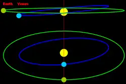 - ^ Although the inclination between these two orbital planes is only 3.4°, Venus can be as far as 9.6° from the Sun when viewed from the Earth at inferior conjunction.