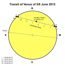 | 5–6 June 2012 | 22:09 | 01:29 | 04:49 | Visible in its entirety from the Pacific and Eastern Asia, with the beginning of the transit visible from North America and the end visible from Europe. First transit while a spacecraft orbits Venus. |