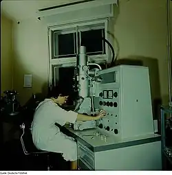 After World War II, Ruska resumed work at Siemens, where he continued to develop the electron microscope, producing the first microscope with 100k magnification.[12] The fundamental structure of this microscope design, with multi-stage beam preparation optics, is still used in modern microscopes. The worldwide electron microscopy community advanced with electron microscopes being manufactured in Manchester UK, the USA (RCA), Germany (Siemens) and Japan (JEOL). The first international conference in electron microscopy was in Delft in 1949, with more than one hundred attendees.[11] Later conferences included the "First" international conference in Paris, 1950 and then in London in 1954.
