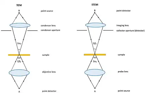 The optical reciprocity theorem, or principle of Helmholtz reciprocity, generally holds true for elastically scattered electrons, as is often the case under standard TEM operating conditions.[21][22] The theorem states that the wave amplitude at some point B as a result of electron point source A would be the same as the amplitude at A due to an equivalent point source placed at B.[22] Simply stated, the wave function for electrons focused through any series of optical components that includes only scalar (i.e. not magnetic) fields will be exactly equivalent if the electron source and observation point are reversed. R