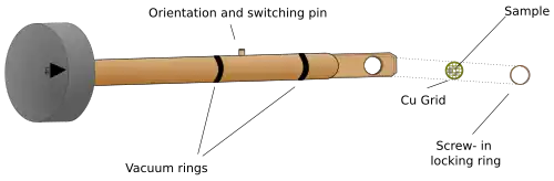 The second design is the top-entry holder consists of a cartridge that is several cm long with a bore drilled down the cartridge axis. The specimen is loaded into the bore, possibly using a small screw ring to hold the sample in place. This cartridge is inserted into an airlock with the bore perpendicular to the TEM optic axis. When sealed, the airlock is manipulated to push the cartridge such that the cartridge falls into place, where the bore hole becomes aligned with the beam axis, such that the beam travels down the cartridge bore and into the specimen. Such designs are typically unable to be tilted without blocking the beam path or interfering with the objective lens.[25]
