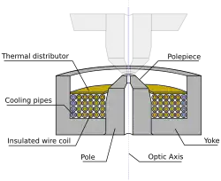 The coils which produce the magnetic field are located within the lens yoke. The coils can contain a variable current, but typically use high voltages, and therefore require significant insulation in order to prevent short-circuiting the lens components. Thermal distributors are placed to ensure the extraction of the heat generated by the energy lost to resistance of the coil windings. The windings may be water-cooled, using a chilled water supply in order to facilitate the removal of the high thermal duty.