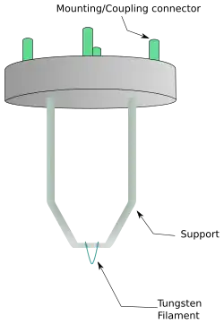 This equation shows that in order to achieve sufficient current density it is necessary to heat the emitter, taking care not to cause damage by application of excessive heat. For this reason materials with either a high melting point, such as tungsten, or those with a low work function (LaB6) are required for the gun filament.[37] Furthermore, both lanthanum hexaboride and tungsten thermionic sources must be heated in order to achieve thermionic emission, this can be achieved by the use of a small resistive strip. To prevent thermal shock, there is often a delay enforced in the application of current to the tip, to prevent thermal gradients from damaging the filament, the delay is usually a few seconds for LaB6, and significantly lower for tungsten.