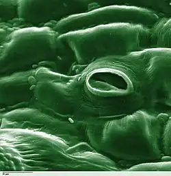 Transpiration is the process of water movement through a plant and its evaporation from aerial parts, such as leaves, stems and flowers. It is a passive process that requires no energy expense by the plant.[1] Transpiration also cools plants, changes osmotic pressure of cells, and enables mass flow of mineral nutrients. When water uptake by the roots is less than the water lost to the atmosphere by evaporation, plants close small pores called stomata to decrease water loss, which slows down nutrient uptake and decreases CO2 absorption from the atmosphere limiting metabolic processes, photosynthesis, and growth.[2]