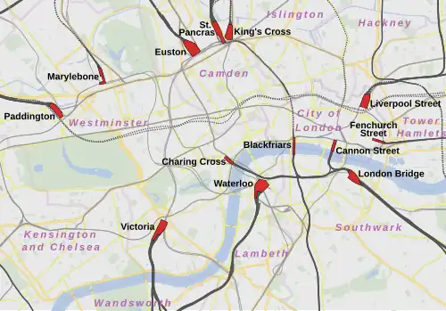 Long-distance intercity services are provided at some London rail termini. Because the termini and intercity routes were largely built by competing companies, many termini serve cities in overlapping regions or different parts of the same region: