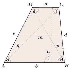The lengths of the diagonals are where is the short base, is the long base, and and are the trapezoid legs.[42]