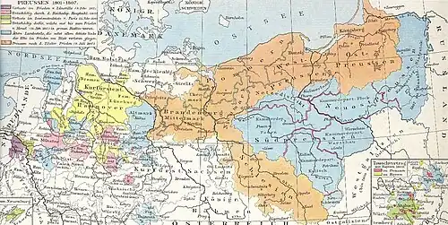Prussia in 1807 (orange) and its territories lost at Tilsit (other colours).