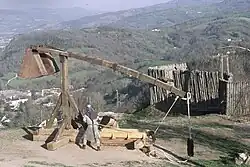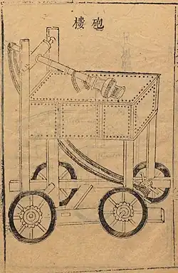 The first recorded use of traction trebuchets was in ancient China. They were probably used by the Mohists as early as 4th century BC; descriptions can be found in the Mozi (compiled in the 4th century BC).[6][36] According to the Mozi, the traction trebuchet was 17 ft (5.2 m) high with 4 ft (1.2 m) buried below ground, the fulcrum attached was constructed from the wheels of a cart, the throwing arm was 30–35 ft (9.1–10.7 m) long with three quarters above the pivot and a quarter below to which the ropes are attached, and the sling 2.8 ft (0.85 m) long. The range given for projectiles are 300 ft (91 m), 180 ft (55 m), and 120 ft (37 m). They were used as defensive weapons stationed on walls and sometimes hurled hollowed-out logs filled with burning charcoal to destroy enemy siege works.[37][38] By the 1st century AD, commentators were interpreting other passages in texts such as the Zuo zhuan and Classic of Poetry as references to the traction trebuchet: "the guai is 'a great arm of wood on which a stone is laid, and this by means of a device [ji] is shot off and so strikes down the enemy.'"[39] The Records of the Grand Historian say that "The flying stones weigh 12 catties and by devices [ji] are shot off 300 paces."[39] Traction trebuchets went into decline during the Han dynasty due to long periods of peace but became a common siege weapon again during the Three Kingdoms period. They were commonly called stone-throwing machines, thunder carriages, and stone carriages in the following centuries. They were used as ship mounted weapons by 573 for attacking enemy fortifications.[40] It seems that during the early 7th century, improvements were made on traction trebuchets, although it is not explicitly stated what. According to a stele in Barkul celebrating Tang Taizong's conquest of what is now Ejin Banner, the engineer Jiang Xingben made great advancements on trebuchets that were unknown in ancient times. Jiang Xingben participated in the construction of siege engines for Taizong's campaigns against the Western Regions.[41] In 617 Li Mi (Sui dynasty) constructed 300 trebuchets for his assault on Luoyang, in 621 Li Shimin did the same at Luoyang, and onward into the Song dynasty when in 1161, trebuchets operated by Song dynasty soldiers fired bombs of lime and sulphur against the ships of the Jin dynasty navy during the Battle of Caishi.[42][43]
