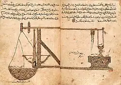 There is little to no consensus as to where and when the counterweight trebuchet, which has been described as the "most powerful weapon of the Middle Ages",[69] was first developed.[70] The earliest known description and illustration of a counterweight trebuchet comes from a commentary on the conquests of Saladin by Mardi ibn Ali al-Tarsusi in 1187.[71][72] However cases for the existence of both European and Muslim counterweight trebuchets prior to 1187 have been made. In 1090, Khalaf ibn Mula'ib threw out a man from the citadel in Salamiya with a machine and in the early 12th century, Muslim siege engines were able to breach crusader fortifications. David Nicolle argues that these events could have only been possible with the use of counterweight trebuchets.[73]