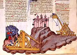 According to the Miracles of Saint Demetrius, probably written around 620 by John, Archbishop of Thessaloniki, the Avaro-Slavs attacked Thessaloniki in 586 with traction trebuchets. The bombardment lasted for hours, but the operators were inaccurate and most of the shots missed their target. When one stone did reach their target, it "demolished the top of the rampart down to the walkway."[52] The Byzantines adopted the traction trebuchet possibly as early as 587, the Persians in the early 7th century, and the Arabs in the second half of the 7th century.[53] In 652, the Arabs used trebuchets at the siege of Dongola in the Sudan.[54][55] Like the Chinese, by 653, the Arabs also had ship mounted traction trebuchets.[56] The Franks and Saxons adopted the weapon in the 8th century.[57] The Life of Louis the Pious contains the earliest western European reference to mangonels (traction trebuchets) in its account of the siege of Tortosa (808–809).[58] In 1173, the Republic of Pisa tried to capture an island castle with traction trebuchet on galleys.[59] Traction trebuchets were also used in India.[48]