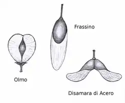 Seeds are the primary way that trees reproduce and their seeds vary greatly in size and shape. Some of the largest seeds come from trees, but the largest tree, Sequoiadendron giganteum, produces one of the smallest tree seeds.[83] The great diversity in tree fruits and seeds reflects the many different ways that tree species have evolved to disperse their offspring. For a tree seedling to grow into an adult tree it needs light. If seeds only fell straight to the ground, competition among the concentrated saplings and the shade of the parent would likely prevent it from flourishing. Many seeds such as birch are small and have papery wings to aid dispersal by the wind. Ash trees and maples have larger seeds with blade shaped wings which spiral down to the ground when released. The kapok tree has cottony threads to catch the breeze.[84] The flame tree Delonix regia shoots its seeds through the air when the two sides of its long pods crack apart explosively on drying.[84] The miniature cone-like catkins of alder trees produce seeds that contain small droplets of oil that help disperse the seeds on the surface of water. Mangroves often grow in water and some species have buoyant fruits with seeds that start germinating before they detach from the parent tree.[85][86] These float on the water and may become lodged on emerging mudbanks and successfully take root.[84]