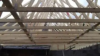 Wood is used in the construction of buildings, bridges, trackways, piles, poles for power lines, masts for boats, pit props, railway sleepers, fencing, hurdles, shuttering for concrete, pipes, scaffolding and pallets. In housebuilding it is used in joinery, for making joists, roof trusses, roofing shingles, thatching, staircases, doors, window frames, floor boards, parquet flooring, panelling and cladding.[128]