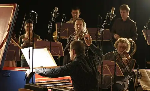 Trevor Pinnock generally directs while playing harpsichord continuo.