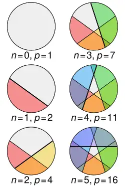 The maximum number of pieces, p obtainable with n straight cuts is the n-th triangular number plus one, forming the lazy caterer's sequence (OEIS A000124)