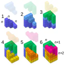 Six triangular pyramids with n steps fit in a cuboid of size n(n + 1)(n + 2) [10]