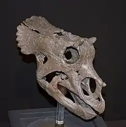 Although not confidently assignable, fossils possibly belonging to Triceratops were described as two taxa, Agathaumas sylvestris and Polyonax mortuarius, in 1872 and 1874, respectively, by Marsh's archrival Edward Drinker Cope.[7][8] Agathaumas was named based on a pelvis, several vertebrae, and a few ribs collected by Fielding Bradford Meek and Henry Martyn Bannister near the Green River of southeastern Wyoming from layers coming from the Maastrichtian Lance Formation.[9] Due to the fragmentary nature of the remains, it can only confidently be assigned to Ceratopsidae.[10][11] Polyonax mortuarius was collected by Cope himself in 1873 from northeastern Colorado, possibly coming from the Maastrichtian Denver Formation.[12][8] The fossils only consisted of fragmentary horn cores, 3 dorsal vertebrae, and fragmentary limb elements.[8] Polyonax has the same issue as Agathaumas, with the fragmentary remains non-assignable beyond Ceratopsidae.[13][10]