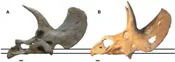 34. ^ Scannella, John B.; Fowler, Denver W.; Goodwin, Mark B.; Horner, John R. (July 15, 2014). "Evolutionary trends in Triceratops from the Hell Creek Formation, Montana". Proceedings of the National Academy of Sciences. 111 (28): 10245–10250. Bibcode:2014PNAS..11110245S. doi:10.1073/pnas.1313334111. ISSN 0027-8424. PMC 4104892. PMID 24982159.