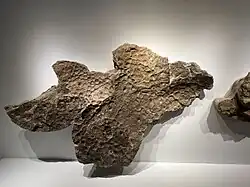A Triceratops nicknamed "Lane" (HMNS PV.1506) that was unearthed on the Zerbst Ranch in Wyoming in 2002 is preserved with large areas of fossil skin over its trunk−both the nearly complete skeleton and the skin fossil are on display at the Houston Museum of Natural Science. The skin is not preserved as an impression but as a thin layer of clay that formed from a bacterial mat on the desiccated body and recorded the skin in positive relief with exceptional detail, a form of fossilization called "clay templating" that was only recognized recently based on analysis of two Edmontosaurus "mummy" specimens first described in 2025 from the same Wyoming area, dubbed the "mummy zone." Contrary to earlier sources, actual fossilized skin is not preserved.[42][43] The scales have conical projections rising from their center, suggesting the possible presence of bristles or quills.[44] A preserved piece of skin from the frill of a specimen is also known, which consists of small polygonal basement scales.[45]