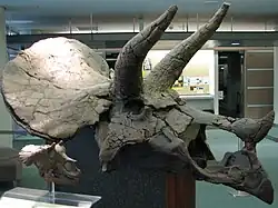 33. ^ "Denver museum unveils 7-foot-long, 1,000-pound Triceratops skull". The Daily Courier. November 18, 2003. Archived from the original on May 19, 2021. Retrieved December 26, 2013.