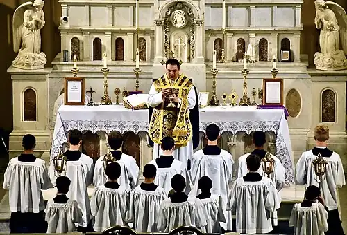 The first line of the Gloria[55] is taken from Lk2:14. The Gloria is omitted during the penitential liturgical seasons of Advent, Septuagesima, Lent, and Passiontide, in which violet vestments are worn, but is used on feasts falling during such seasons, as well as on Holy (Maundy) Thursday. It is always omitted for a Requiem Mass.