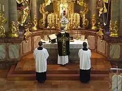 As a cardinal, Joseph Ratzinger was regarded as having a particular interest in the liturgy, and as being favourable towards the pre-Vatican II Mass.[101] Before his election he celebrated it on a number of occasions.[102] He criticized the erratic way in which, contrary to official policy, many priests celebrated the post-Vatican II form.[103]
