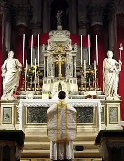 The Tridentine Mass,[1] also known as the Extraordinary Form of the Roman Rite,[2] the usus antiquior (Latin for 'more ancient use'), the Vetus Ordo ('Old Order'), the Traditional Latin Mass (TLM),[3][4] or the Traditional Rite,[5] is the form of Mass found in the Roman Missal of the Catholic Church codified in 1570 and published thereafter with amendments up to 1962. Celebrated almost exclusively in Ecclesiastical Latin, it was the most widely used Eucharistic liturgy in the world from its issuance in 1570 until its replacement by the Mass of Paul VI promulgated in 1969 (with the revised Roman Missal appearing in 1970).[6]