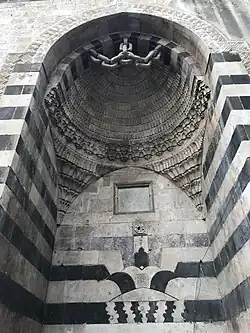 Decorations in Mamluk buildings concentrated on the most conspicuous areas of buildings: minarets, portals, windows, on the outside, and mihrab, qiblah wall, and floor on the inside. Decorations at the time may be subdivided into structural decoration (found outside the buildings and incorporate the medium of construction itself such as ablaq walls, plain or zigzag moldings, fish scale motifs, joggled lintels or voussoirs, inscriptions, and muqarnas) and applied decoration (found inside the buildings and include the use of marble marquetry, stucco, and glass mosaic).[18]