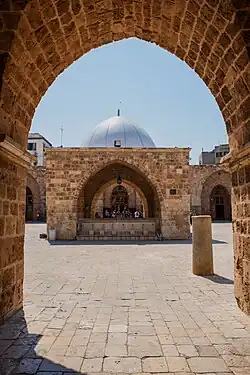 The Mansouri Great Mosque (late 13th century). The arches and courtyard date from the Mamluk period but the minaret is believed to be an earlier Christian structure.[24]