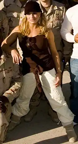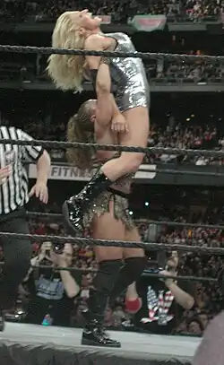 In the following months, Stratus was placed into an alliance with Gail Kim. It was short-lived, however, as Kim turned on Stratus and teamed with Molly Holly, putting the women in a storyline feud.[9] The duo defeated Stratus and several tag team partners until Stratus allied herself with a returning Lita.[46][47][48] The team defeated Kim and Holly in several matches, including a match at Unforgiven.[49] Stratus began an on-screen romance with Chris Jericho during the November 10 episode of Raw when she agreed to go on a date with him.[50] Subsequently, they participated in an intergender tag team match as partners on December 1. After the match, Stratus overheard Jericho talking to then-heel, Christian, who was involved in an on-screen romance with Lita at the time, about who could sleep with their respective woman first.[51] One week later, Stratus and Lita confronted the men about their actions, leading to a feud between the two men and women which resulted in a "Battle of the Sexes" tag team match at Armageddon, which the women lost.[52] A rematch the next night ended in a no contest.[53] Her relationship with Jericho continued into the next year with a new angle of Stratus developing feelings for Jericho. Christian would also briefly turn face once again, but only revealed to be a hoax as he would attack and defeat her in a match ordered by Eric Bischoff. This would start a feud between Christian and Jericho, who was defending Stratus. During their match at WrestleMania XX, however, Stratus turned heel by betraying Jericho and siding with Christian. Stratus claimed her reasons for siding with Christian were that he was a "real man", and Jericho was a "love sick puppy".[1][15] The duo feuded with Jericho for several months and competed in a 2-on-1 Handicap match at Backlash.[54] The team of Stratus and Christian were joined by "problem solver" Tyson Tomko the next night on Raw.[55]