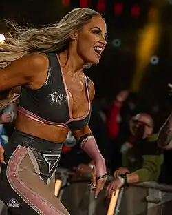 During a September 2020 episode of Raw, Mandy Rose paid tribute to Stratus by wearing pink gear identical to an attire worn by Stratus in the early 2000s.[141] She later cited Stratus as her role model. She added; "She's always been my inspiration, and still to this day [she is]."[142] Zelina Vega asserted that Stratus and Lita inspired her to become a professional wrestler,[143] while fellow WWE Hall of Famer Sunny stated: "I do have to say, I mean the only person that I actually could sit and watch a match would be Trish Stratus. I give her all the props in the world. She's like the one person who came after me that I actually have 100% respect for because she came from nowhere and worked so hard and learned so much. She's the kind of person that does respect the business, you know? She was in it because she loved it not because it was a quick dollar."[144]