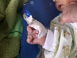 Trisomy 18, also known as Edwards syndrome, is a genetic disorder caused by the presence of a third copy of all or part of chromosome 18.[3] Many parts of the body are affected.[3] Babies are often born small and have heart defects.[3] Other features include a small head, small jaw, clenched fists with overlapping fingers, and severe intellectual disability.