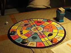 During the game, players move their playing pieces around a board which is shaped like a wheel with six spokes, rolling a single die to determine how far to move. The board is divided into spaces of different colors, and the center space is a hexagonal "hub." At the end of each spoke is a "category headquarters" space. After landing on a space, the player is asked a question in the category corresponding to its color. A correct answer allows the player to roll the die again and continue their turn, while a miss passes control to the next player in sequence. Questions must be answered without any outside assistance. Landing on a category headquarters space and answering correctly awards a wedge in that color, if the player does not yet have one; wedges are fitted into the playing pieces as they are earned. The player may move in any available direction and change directions at any category headquarters space or the hub, but may not backtrack.