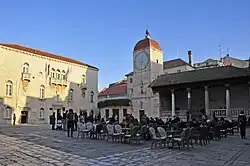 The Town Loggia of Trogir was first recorded in documents of the 13th century. It served as a furnished public gathering space, and on certain dates and hours it was used by the communal legal service, as a place were contracts were signed, official announcements made, laws proclaimed, and where law proceedings took place. In 1471, the workshop of Niccolo di Giovanni Fiorentino executed a relief of Justice on the eastern wall, depicting the Venetian lion with S. Lawrence and B. John of Trogir, both guardians of the city. It was, in fact, a monument dedicated to the Republic of Venice. The central field with the lion was removed in 1932. On the south wall, the relief of a horseman depicting Petar Berislavić, viceroy of Croatia (1513–1520), was done by Ivan Meštrović. The Loggia was renovated in 1892.