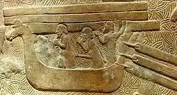 Ships with a horsehead decoration, perhaps cult ships, are also represented in artifacts of the Minoan/Mycenaean era;[22][23] the image[24] on a seal found in the palace of Knossos, dated around 1200 BC, which depicts a ship with oarsmen and a superimposed horse figure, originally interpreted as a representation of horse transport by sea,[25] may in fact be related to this kind of vessel, and even be considered as the first (pre-literary) representation of the Trojan Horse episode.[26]