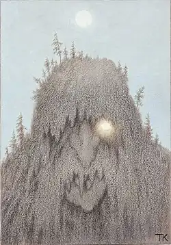 Smaller trolls are attested as living in burial mounds and in mountains in Scandinavian folk tradition.[13] In Denmark, these creatures are recorded as troldfolk ("troll-folk"), bjergtrolde ("mountain-trolls"), or bjergfolk ("mountain-folk") and in Norway also as trollfolk[14] ("troll-folk") and tusser.[13] Trolls may be described as small, human-like beings or as tall as men depending on the region of origin of the story.[15]