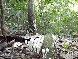 This high rate of decomposition is the result of phosphorus levels in the soils, precipitation, high temperatures and the extensive microorganism communities.[25] In addition to the bacteria and other microorganisms, there are an abundance of other decomposers such as fungi and termites that aid in the process as well. Nutrient recycling is important because below ground resource availability controls the above ground biomass and community structure of tropical rainforests. These soils are typically phosphorus limited, which inhibits net primary productivity or the uptake of carbon.[22] The soil contains microbial organisms such as bacteria, which break down leaf litter and other organic matter into inorganic forms of carbon usable by plants through a process called decomposition. During the decomposition process the microbial community is respiring, taking up oxygen and releasing carbon dioxide. The decomposition rate can be evaluated by measuring the uptake of oxygen. High temperatures and precipitation increase decomposition rate, which allows plant litter to rapidly decay in tropical regions, releasing nutrients that are immediately taken up by plants through surface or ground waters. The seasonal patterns in respiration are controlled by leaf litter fall and precipitation, the driving force moving the decomposable carbon from the litter to the soil. Respiration rates are highest early in the wet season because the recent dry season results in a large percentage of leaf litter and thus a higher percentage of organic matter being leached into the soil.[25]