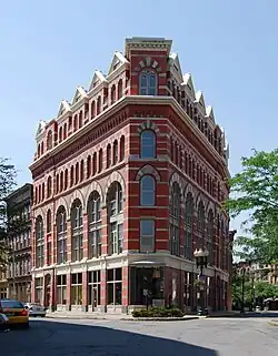 Troy's one-time great wealth was produced in the steel industry, with the first American Bessemer converter erected on the Wynantskill Creek, a stream with falls in a small valley at the south end of the city.[7] The industry first used charcoal and iron ore from the nearby Adirondack Mountains. Later, ore and coal from the Midwest were shipped via the Erie Canal to Troy and were processed before being sent down the Hudson River to New York City. The iron and steel also were used by the extensive federal arsenal located—as it is today—across the Hudson at Watervliet, a community then called West Troy. After the Civil War, the steel production industry moved west to be closer to raw materials. The presence of iron and steel also made it possible for Troy to be an early site in the development of iron storefronts and steel structural supports in architecture, and some significant early examples remain in the city.