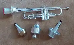 Various types of mutes can be placed in or over the bell, which decreases volume and changes timbre.[25] Trumpets have a wide selection of mutes: common ones include the straight mute, cup mute, harmon mute (wah-wah or wow-wow mute, among other names[26]), plunger, bucket mute, and practice mute.[27] A straight mute is generally used when the type of mute is not specified.[26] Jazz and commercial music call for a wider range of mutes than most classical music[25] and many mutes were invented for jazz orchestrators.[28]