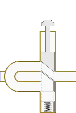 The fingering schema arises from the length of each valve's tubing (a longer tube produces a lower pitch). Valve "1" increases the tubing length enough to lower the pitch by one whole step, valve "2" by one half step, and valve "3" by one and a half steps.[22] This scheme and the nature of the overtone series create the possibility of alternate fingerings for certain notes. For example, third-space "C" can be produced with no valves engaged (standard fingering) or with valves 2–3. Also, any note produced with 1–2 as its standard fingering can also be produced with valve 3 – each drops the pitch by 1+1⁄2 steps. Alternate fingerings may be used to improve facility in certain passages, or to aid in intonation. Extending the third valve slide when using the fingerings 1–3 or 1-2-3 further lowers the pitch slightly to improve intonation.[23]