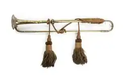 The tubing of the bell section of a herald trumpet is straight, making it long enough to accommodate a hanging banner. This instrument is mostly used for ceremonial events such as parades and fanfares.