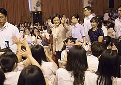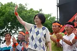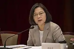 Tsai ran for New Taipei City mayorship in the 2010 municipal elections but was defeated by the KMT candidate, Eric Chu. In April 2011, Tsai became the first woman to be nominated by a major party as a presidential candidate in the history of Taiwan after defeating her former superior, Su Tseng-chang, in the DPP's primary election by a slight margin.[1] In the 2012 Taiwanese presidential election, she was defeated by incumbent president Ma Ying-jeou, but she won her first term of presidency in the 2016 presidential election by a landslide in a rematch against Eric Chu, becoming the first woman to serve as Taiwan's president. In the 2020 presidential election, she was re-elected as president after winning the election against Han Kuo-yu.[2] She was succeeded as president by Lai Ching-te.