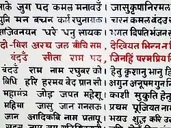 Ramacharitamanas (रामचरितमानस, 1574–1576), "The Mānasa lake brimming over with the exploits of Lord Rāma"[80][81] is an Awadhi rendering of the Ramayana narrative.[25] It is the longest and earliest work of Tulsidas, and draws from various sources including the Ramayana of Valmiki, the Adhyatma Ramayana, the Prasannaraghava and Hanuman Nataka.[78] The work consists of around 12,800 lines divided into 1073 stanzas, which are groups of Chaupais separated by Dohas or Sorthas.[82] It is divided into seven books (Kands) like the Ramayana of Valmiki, and is around one-third of the size of Valmiki's Ramayana.[82] The work is composed in 18 metres which include ten Sanskrit meters (Anushtup, Shardulvikridit, Vasantatilaka, Vamshashta, Upajati, Pramanika, Malini, Sragdhara, Rathoddhata and Bhujangaprayata) and eight Prakrit metres (Soratha, Doha, Chaupai, Harigitika, Tribhangi, Chaupaiya, Trotaka and Tomara).[83][84][85] It is popularly referred to as Tulsikrit Ramayana, literally The Ramayana composed by Tulsidas.[86] The work has been acclaimed as "the living sum of Indian culture", "the tallest tree in the magic garden of medieval Indian poesy", "the greatest book of all devotional literature", "the Bible of Northern India", and "the best and most trustworthy guide to the popular living faith of its people." But, as he has said "The story of the lord is endless as are his glories" (Hindi: हरि अनंत हरि कथा अनंता।).[87]