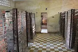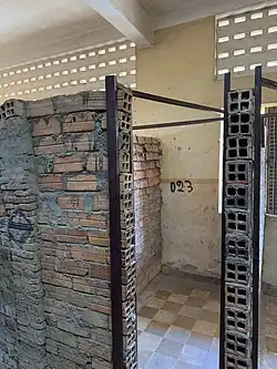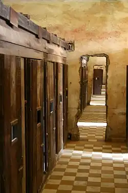 The Tuol Sleng Genocide Museum[a] is a museum for the Cambodian genocide. Located in Phnom Penh, the site is a former secondary school used as an internment facility known as Security Prison 21[b] (S-21) by the Khmer Rouge regime from 1975 until its fall in 1979. From 1976 to 1979, an estimated 20,000 people were imprisoned at Tuol Sleng as one of between 150 and 196 torture and execution centers established by the Khmer Rouge and their secret police.[2]
