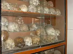 Most prisoners at S-21 were held there for two to three months. Within two or three days after they were brought to S-21, all prisoners were taken for interrogation.[5] The torture system at Tuol Sleng was designed to make prisoners confess to whatever crimes they were charged with by their captors. Prisoners were routinely beaten and tortured with electric shocks, searing hot metal instruments and hanging, as well as through the use of various other devices. Some prisoners were cut with knives or suffocated with plastic bags. Other methods for generating confessions included pulling out fingernails while pouring alcohol on the wounds, holding prisoners' heads under water, and the use of the waterboarding technique. Women were sometimes raped by the interrogators, even though sexual abuse was against Democratic Kampuchea (DK) policy. The perpetrators who were found out were executed.[5] Although many prisoners died from this kind of abuse, killing them outright was discouraged, since the Khmer Rouge needed their confessions. The "Medical Unit" at Tuol Sleng, however, did kill at least 100 prisoners by bleeding them to death.[8] It is proven that medical experiments were performed on certain prisoners. There is clear evidence that patients in Cambodia were sliced open and had organs removed with no anesthetic.[9][10] The camp's director, Kang Kek Iew, has acknowledged that "live prisoners were used for surgical study and training. Draining blood was also done."[11]