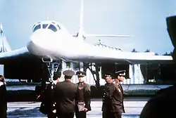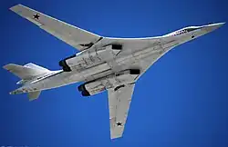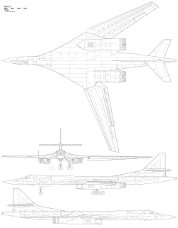 The Tupolev Tu-160 (Russian: Туполев Ту-160 «Белый лебедь», romanized: Bely Lebed, lit. 'White Swan';[1] NATO reporting name: Blackjack) is a supersonic, variable-sweep wing nuclear-capable heavy strategic bomber and airborne missile platform designed by the Tupolev Design Bureau in the Soviet Union in the 1970s. The aircraft is large, longer than a Boeing B-52 Stratofortress at 54 m, with wingspan 56 m when spread, 36 m when swept back. The Tu-160 is operated by the Long Range Aviation branch of the Russian Aerospace Forces.[2]