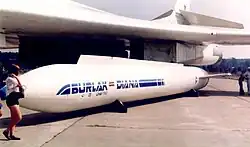 A demilitarized, commercial version of the Tu-160, named Tu-160SK, was displayed at Asian Aerospace in Singapore in 1994 with a model of a small space vehicle named Burlak[41] attached underneath the fuselage.