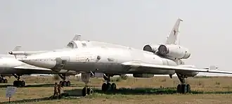 The Tu-22 has a low-middle mounted wing swept at an angle of 55°.[19] The two large turbojet engines, originally 159 kN (36,000 lbf) Dobrynin VD-7M, later 162 kN (36,000 lbf) Kolesov RD-7M2,[20] are mounted atop the rear fuselage on each side of the large vertical stabilizer, with a low-mounted tailplane. Continuing a Tupolev OKB design feature, the main landing gear are mounted in pods at the trailing edge of each wing. The highly swept wings gave little drag at transonic speeds, but resulted in very high landing speeds and a long take-off run.[21][22] This limited the design to "first-class airfields", those with runways at least 3,000 m (9,800 ft) long.[4]