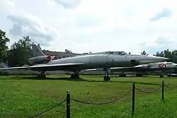 The first prototype 105 was completed and shipped to the Flight Test and Development Base at Zhukovsky in August 1957. It flew for the first time on 21 June 1958, flown by test pilot Yuri Alasheev.[5][6] Initial flights quickly demonstrated that the design had neither the speed nor range that was expected. Around this time, TsAGI read KGB intelligence reports about the area rule for minimizing transonic aerodynamic drag, and this design was applied to 105. A key problem was that the wing root was too thick to properly exploit this effect and to further thin it, a new landing-gear design was introduced, along with several more changes to the layout of the cabin and tail areas.[7]